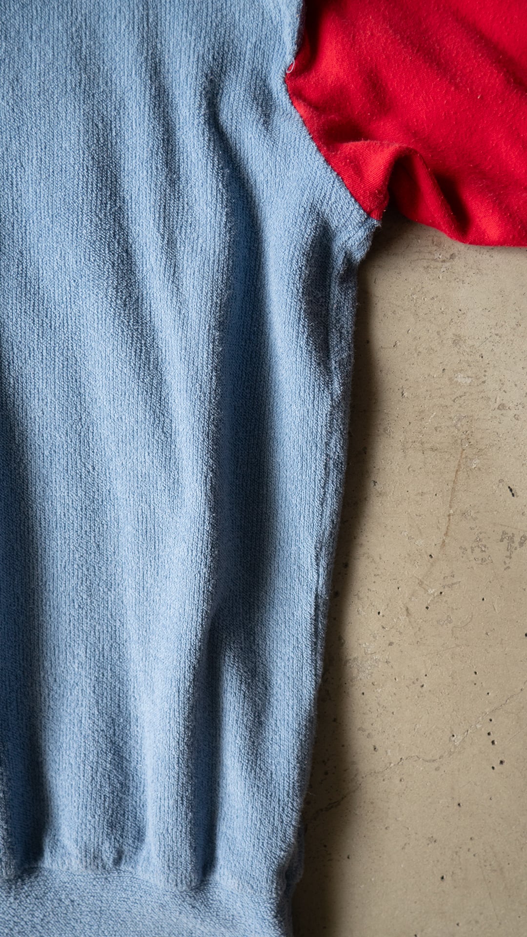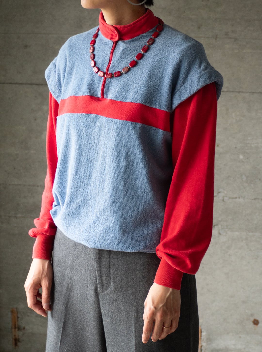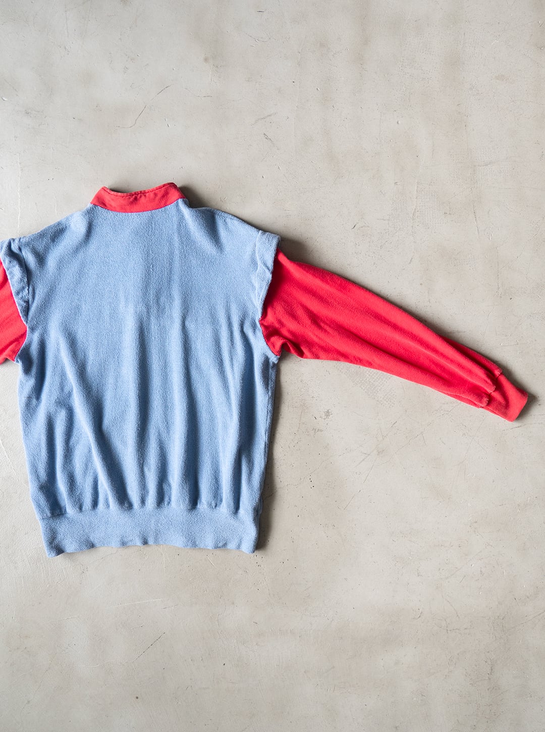 このカットソーは、コットン75%/ポリアミド25%の糸を用いて、柔らかくふっくらとしたブルーグレー色のパイル、滑りの良い赤い天竺とをコンビネーションしたデザインです。肩口の切り替え位置には、被せを作るような持ち出しがあり、キュートなイメージもあります。