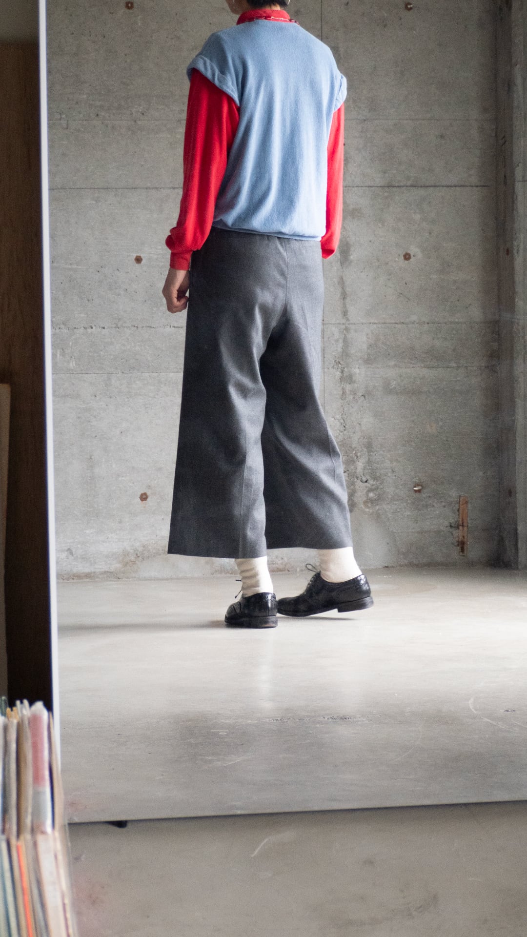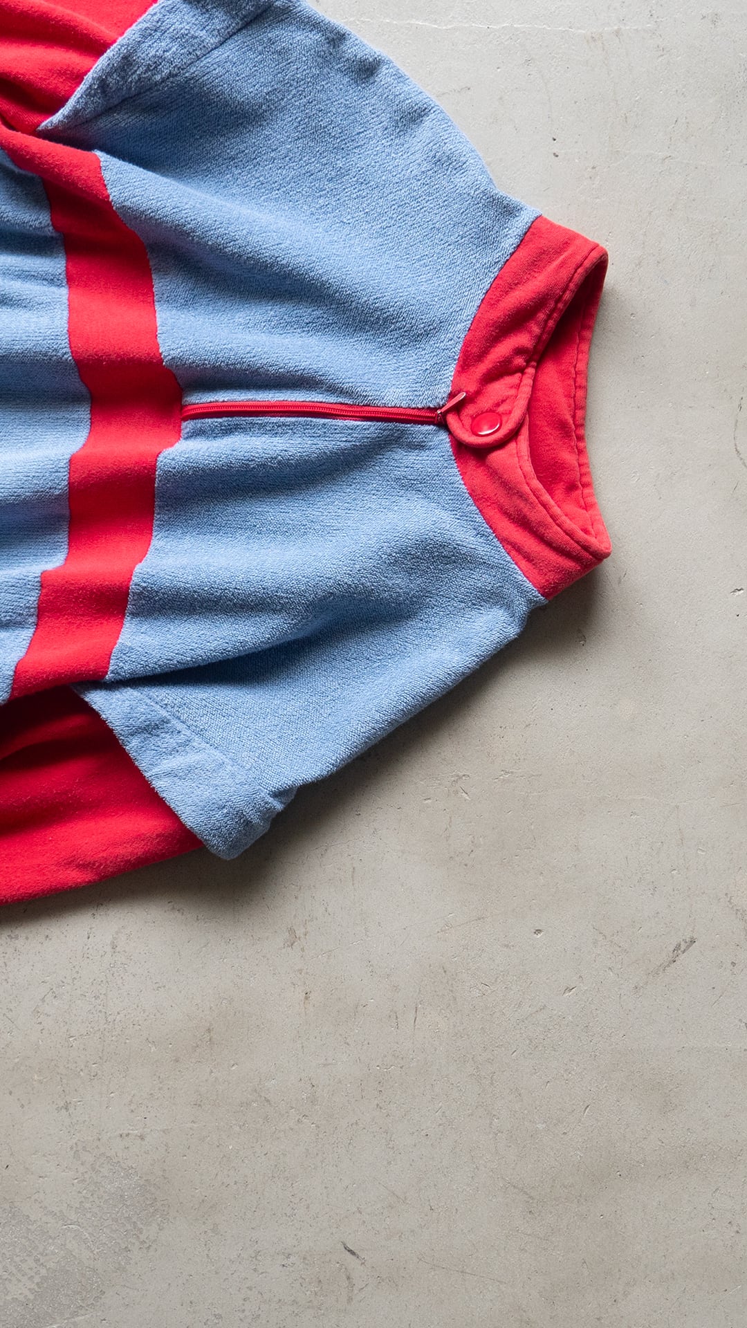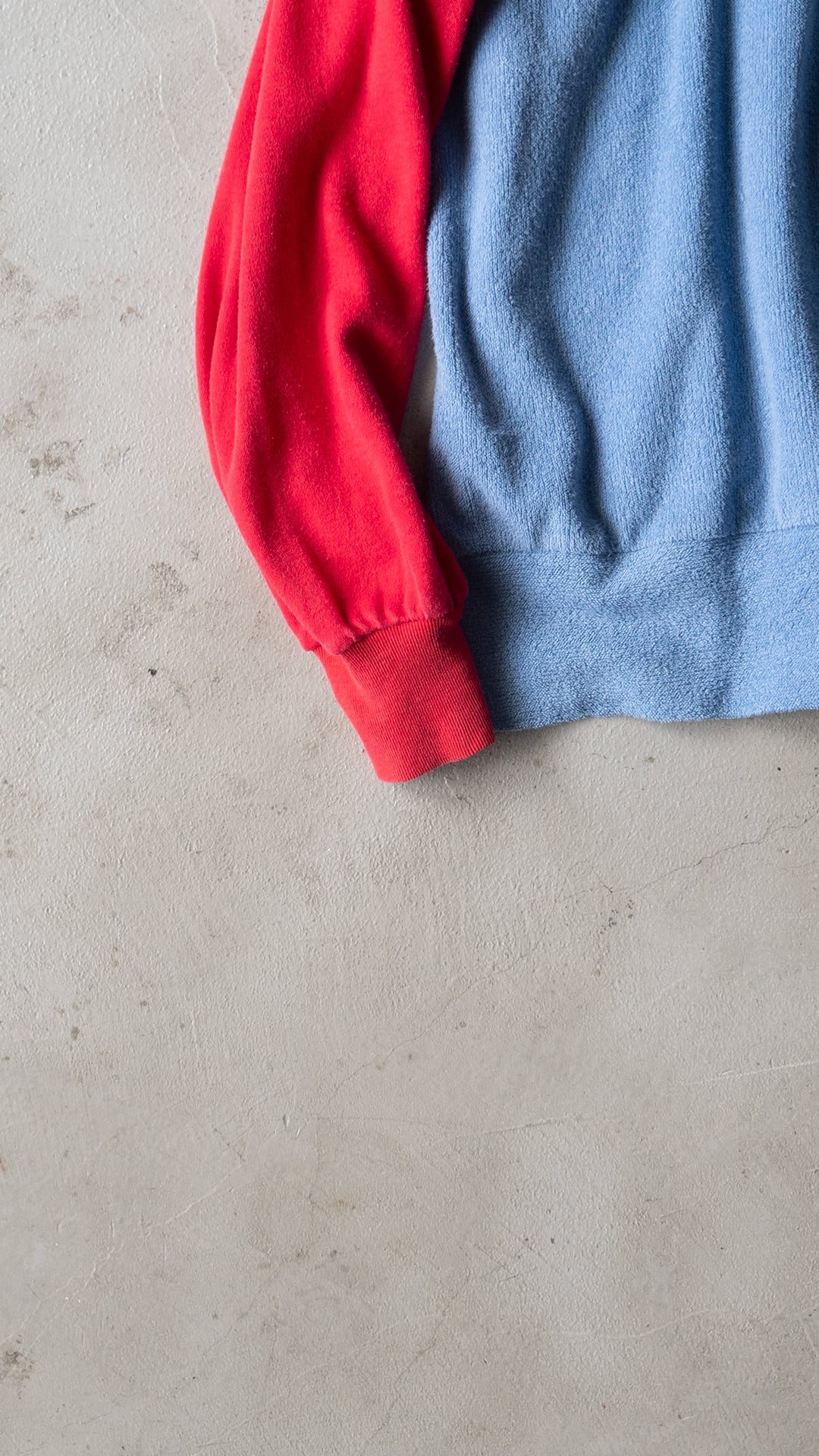 このカットソーは、コットン75%/ポリアミド25%の糸を用いて、柔らかくふっくらとしたブルーグレー色のパイル、滑りの良い赤い天竺とをコンビネーションしたデザインです。肩口の切り替え位置には、被せを作るような持ち出しがあり、キュートなイメージもあります。