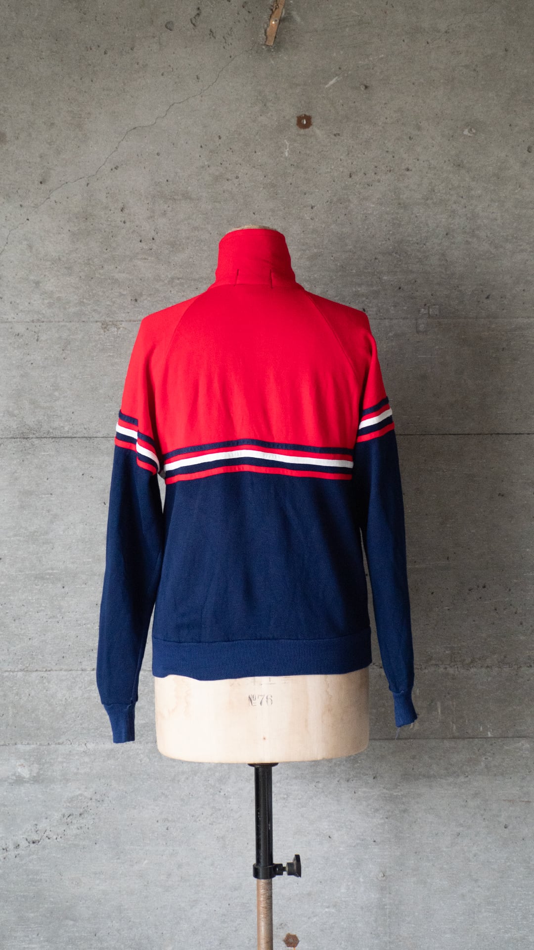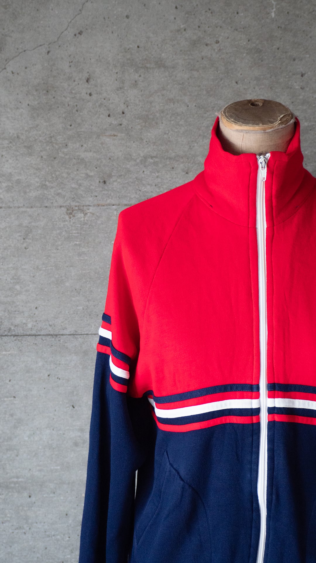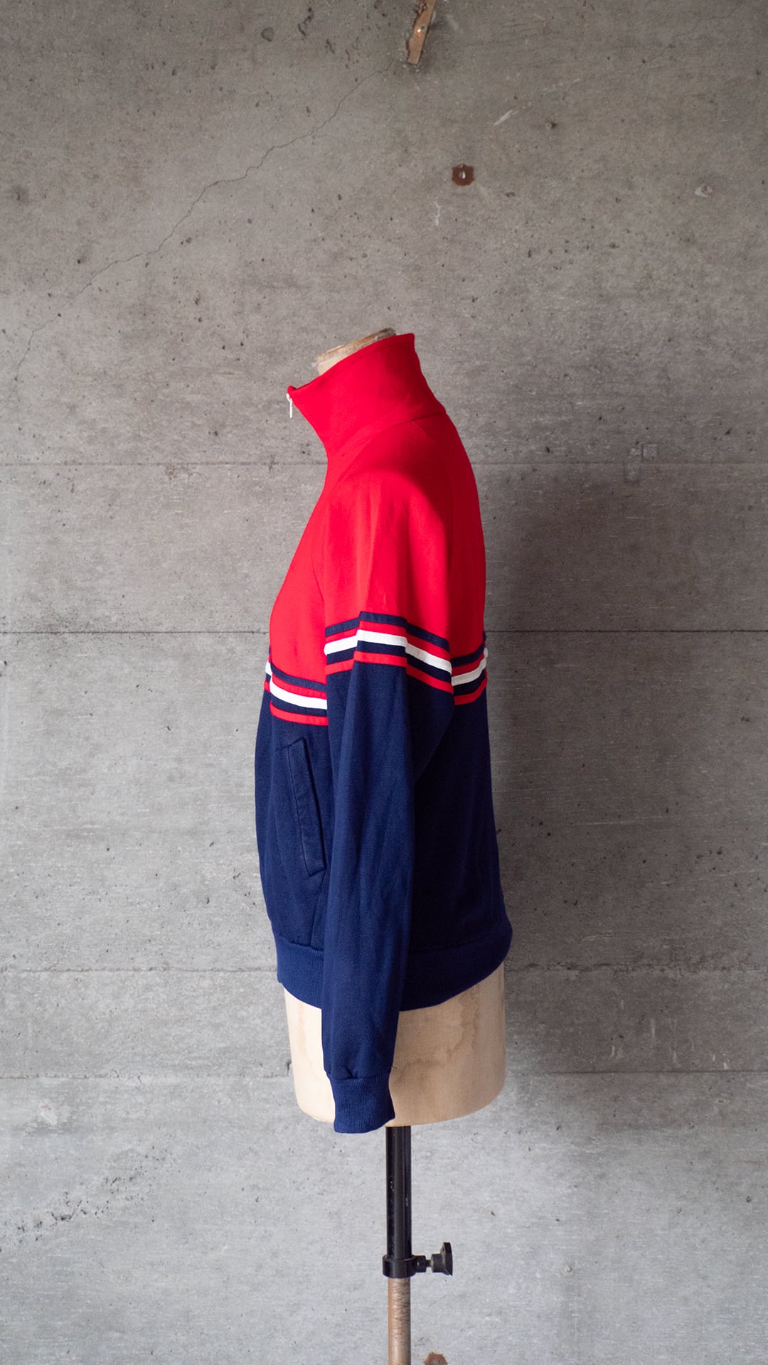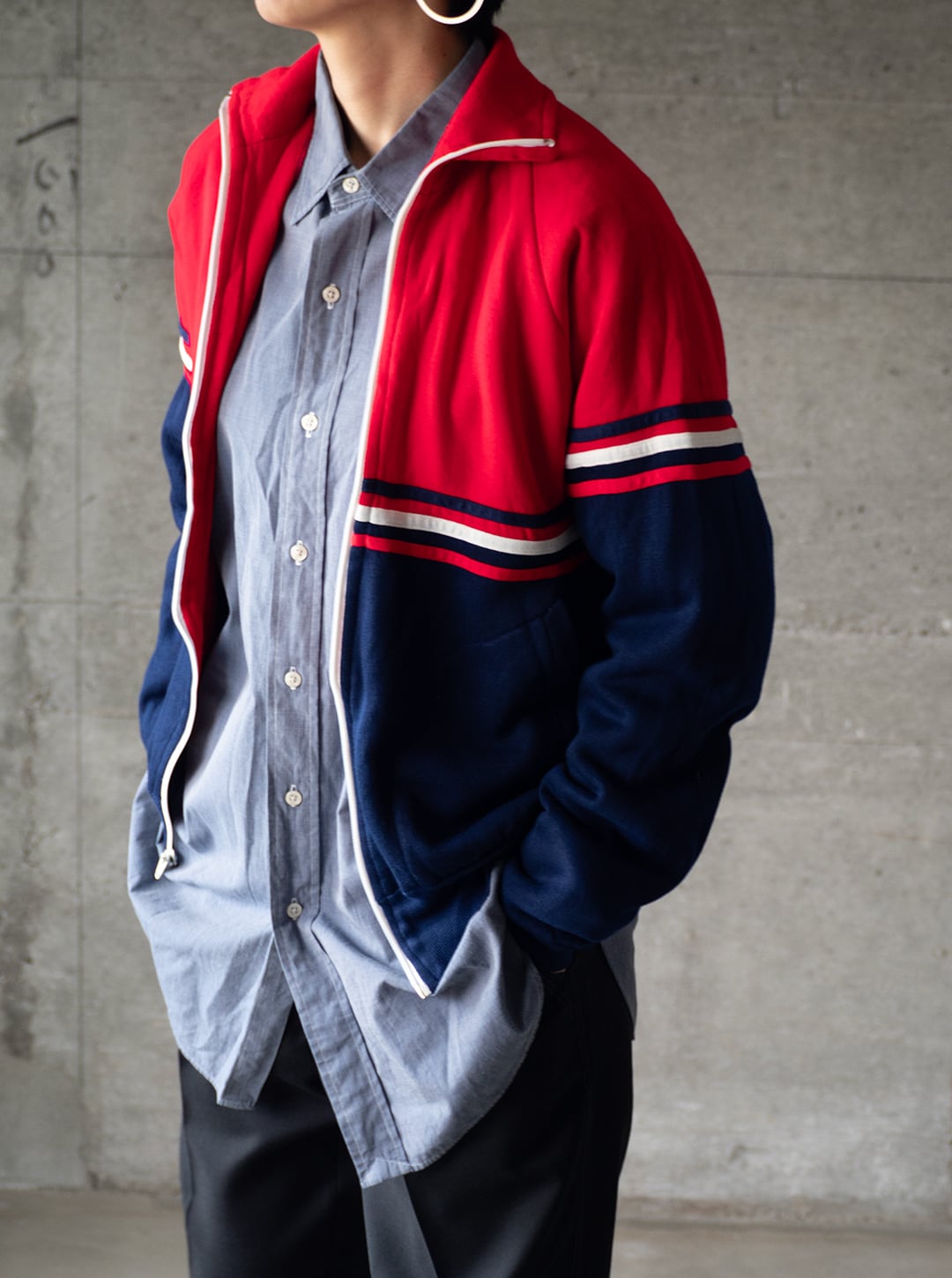 時代を写すカラーリングのラインとカラーブロッキング、丁寧な作りをしたアクリルスウェットのジップトップです。
