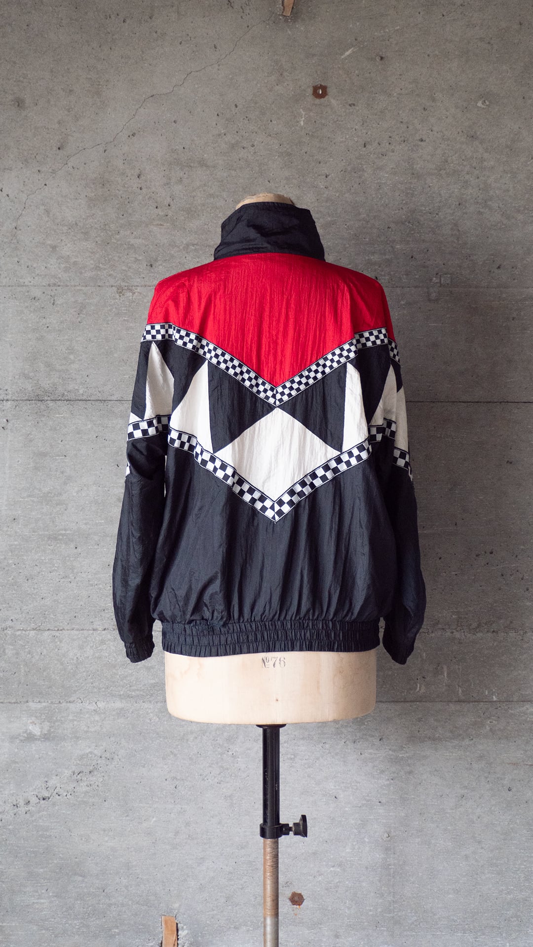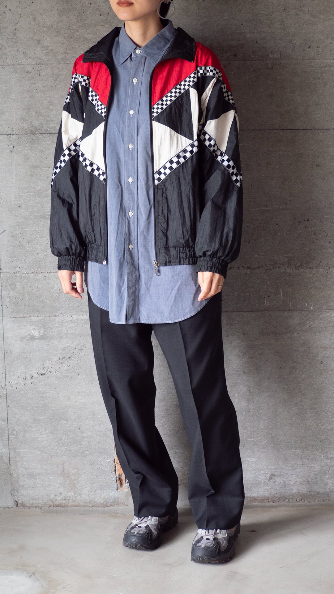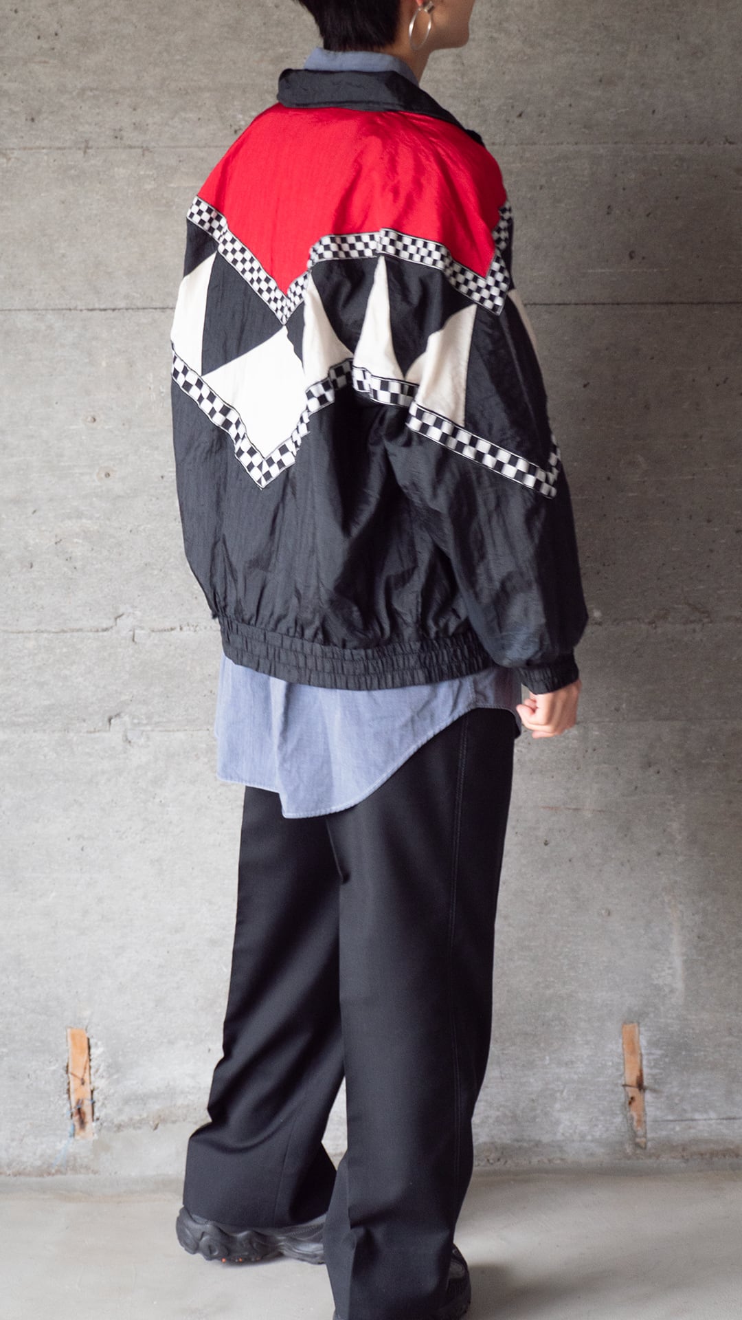 細番手で密度がありながらしなやかで柔らかいナイロン100%のシェルが特徴。赤・黒・チャッカー・白をカラーブロッキングし、レーシングジャケットらしいユニークなカッティングで仕立てられています。