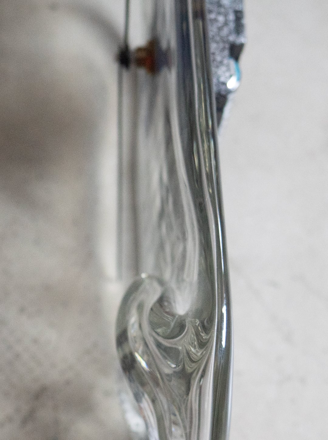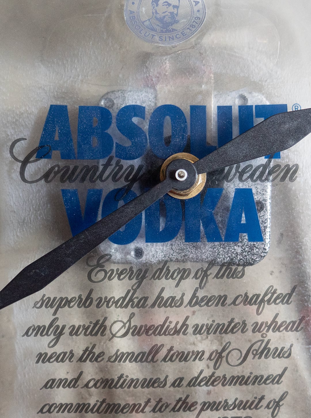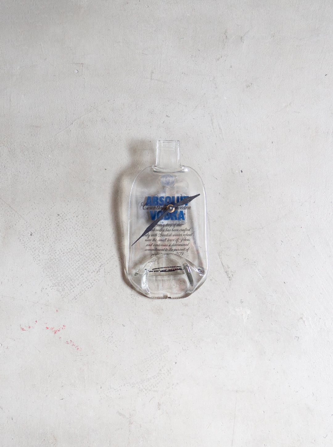 作家は不明ですが、お酒のビンを溶かし、平べったくしたものに駆動を付けた、壁掛け時計です。