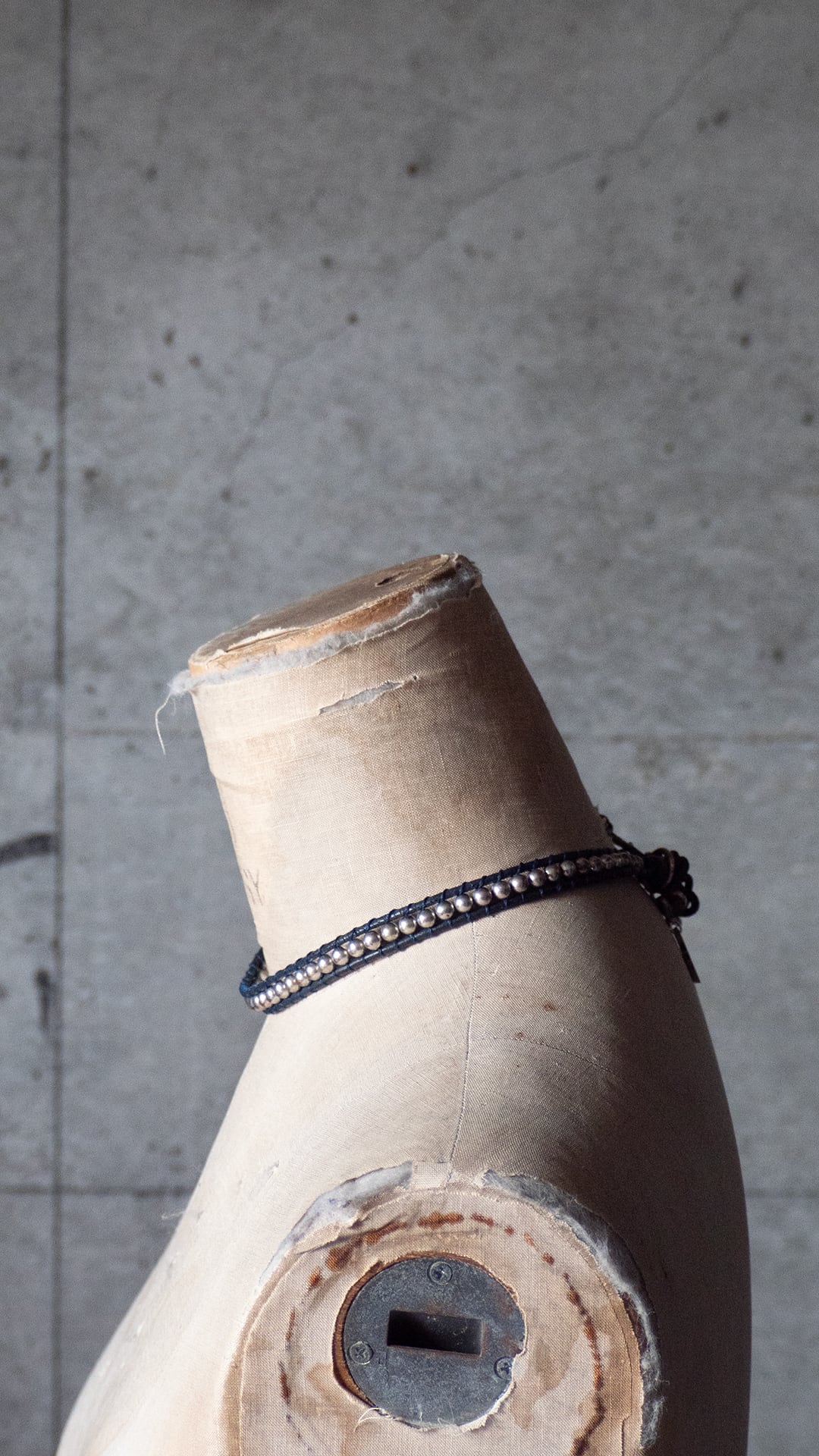 レザーの丸紐を用いて、2本の紐の間にシルバー調のビーズが連なるデザインです。留め具はありませんが、革丸紐の玉結びを反対側のリングに通すことで接続するという仕様。シルバー調のビーズは、銀ではなく、あくまでも合金に塗装を施したものだと思います。