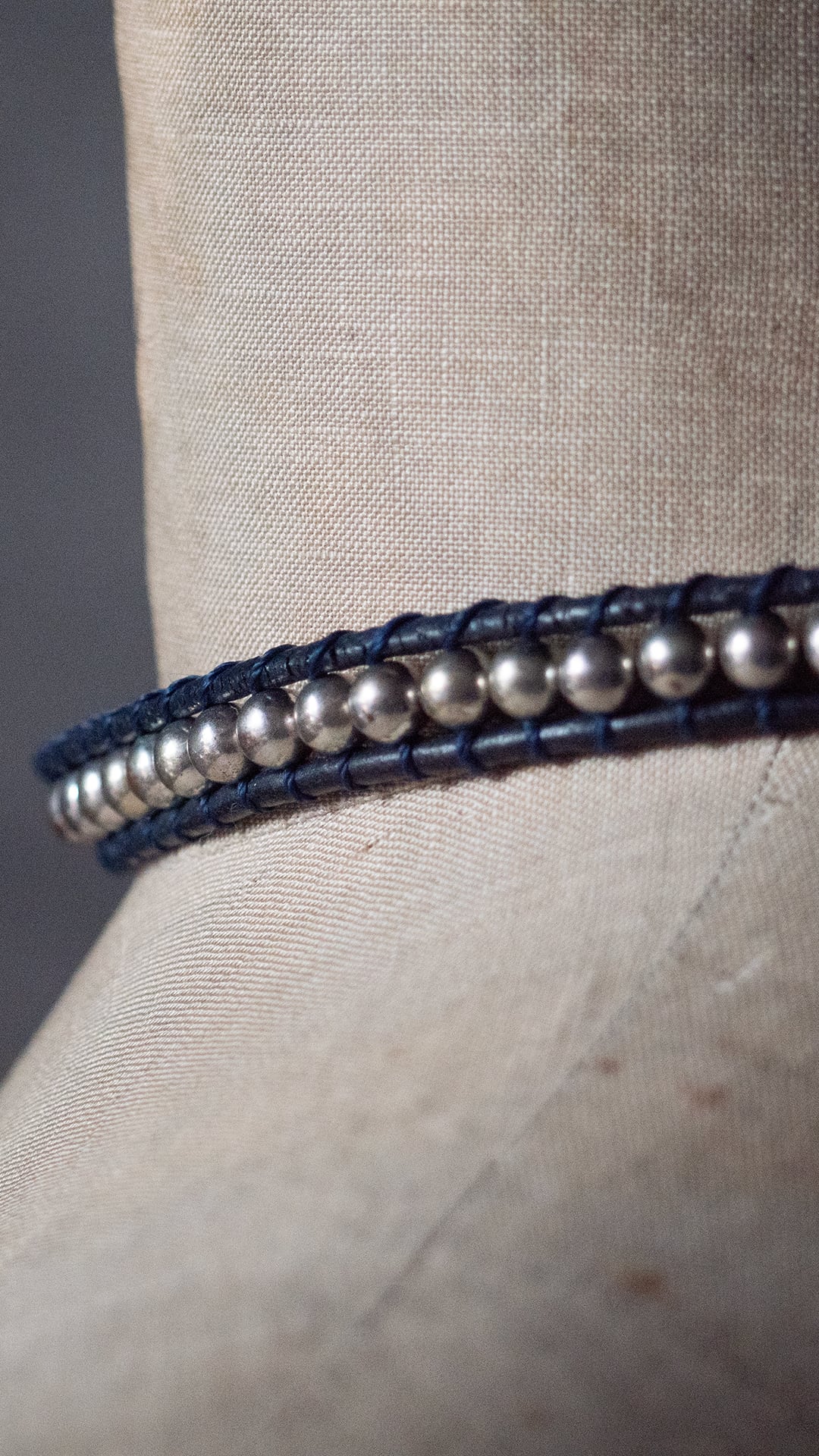 ネイビーカラーの本革丸紐とシルバー調のビーズを連ねたネックスレスです。