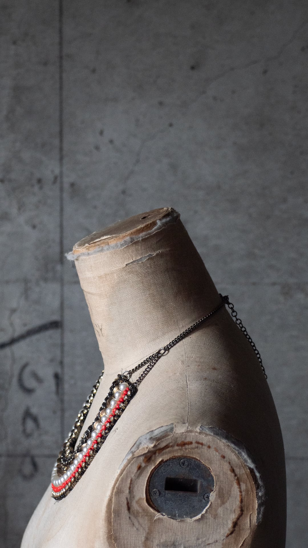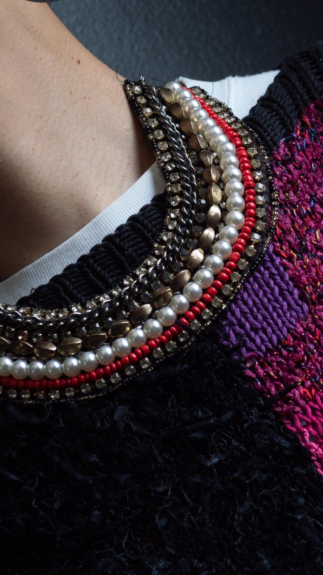 複数種のビーズやチェーン、ガラスストーンなどを組み合わせた、帯状パーツを持つステートメントネックスレスです。
