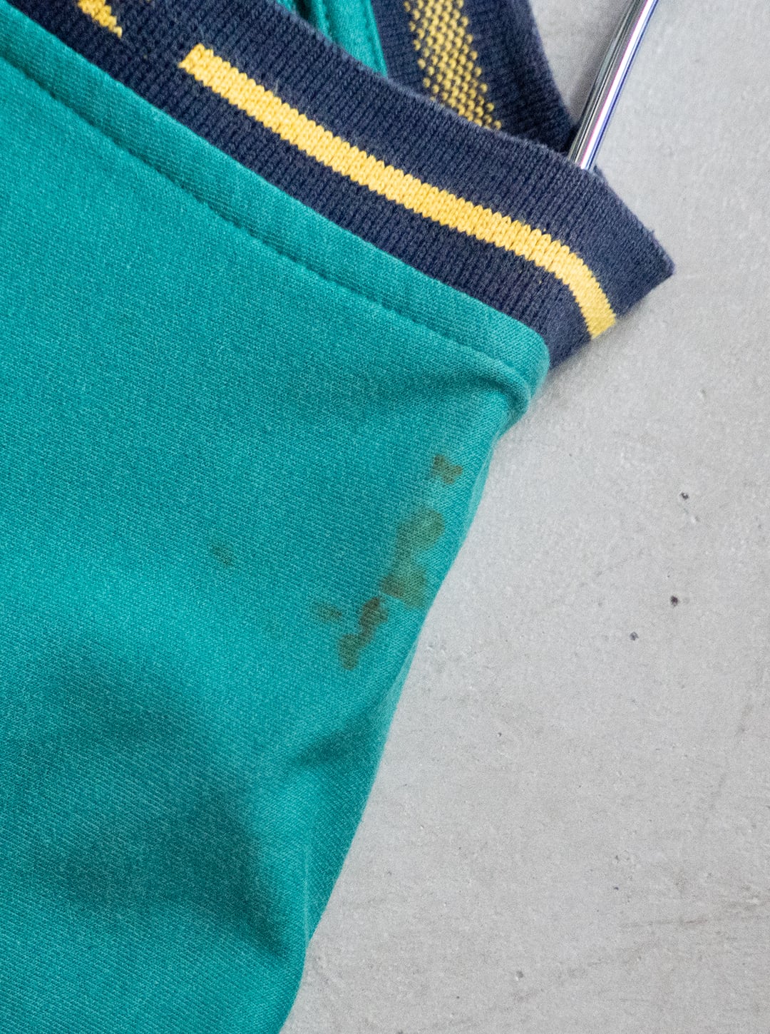 このユニフォームは、もっちりと嵩高でありながら柔らかいコットンポリエステルの編み立て生地を仕様。袖口や衿には配色ラインの入った別編み生地を当てています。カラーブロックの剥ぎ部分にはイエローのパイピングラインを添え、リブやシェブロンマークの輪郭と共通にしています。複雑な仕立てながら、デザイン意識が細部まで行き届いた雰囲気の良い一着だと思います。