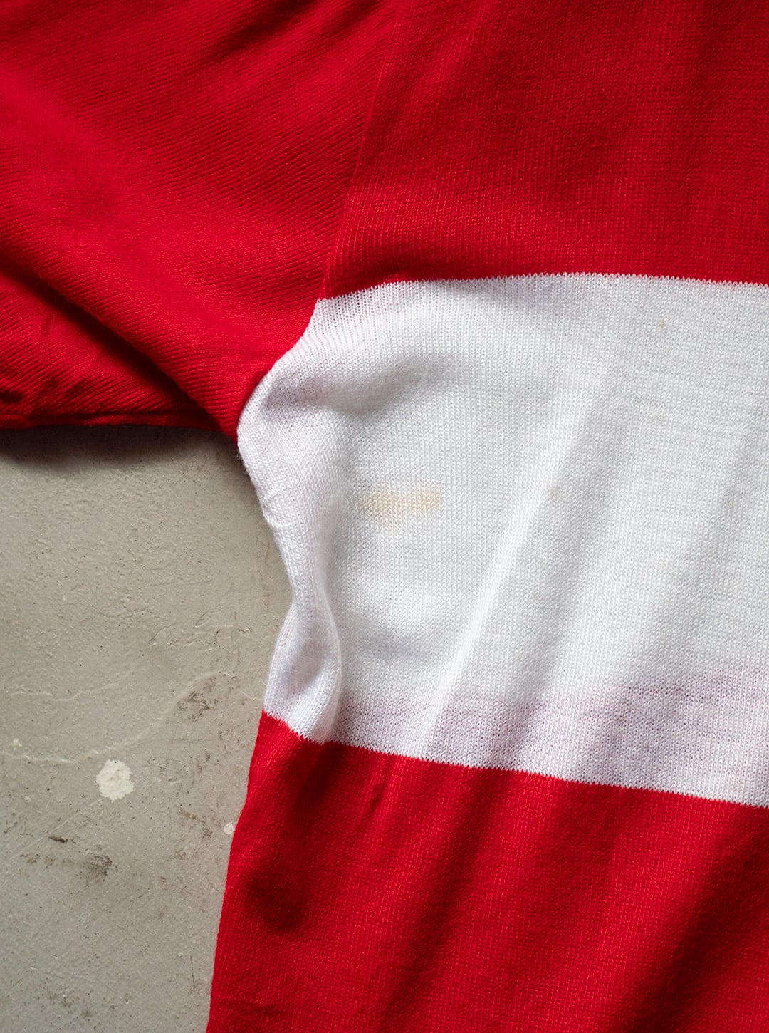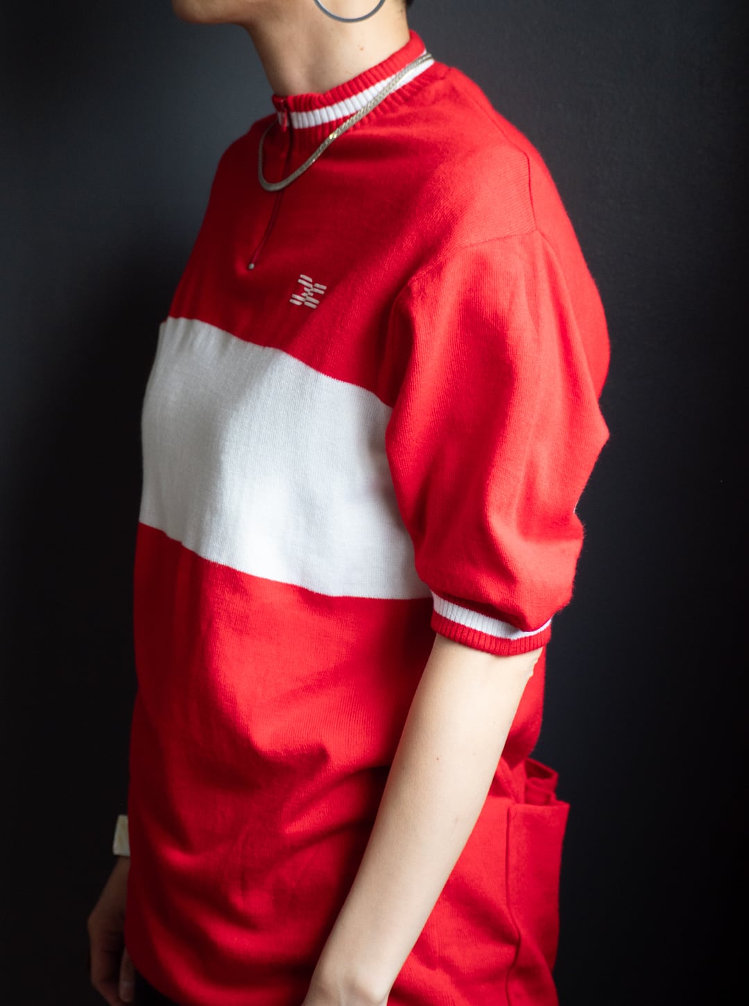 今回の個体は、アクリル100%のハイゲージニットで成型されています。首元、袖口は赤白配色のリブ編みが付属。コンシールファスナーでハーフジップ仕様、背面下部には3つのポケットが付属するサイクリングジャージー定番の形になります。
