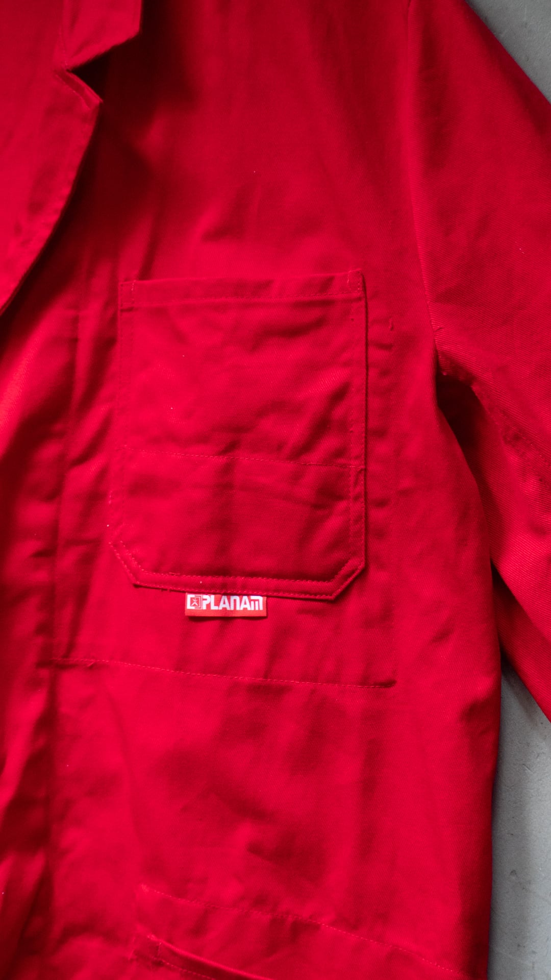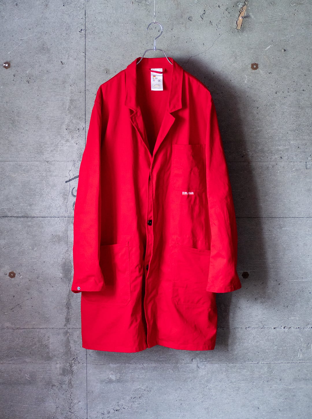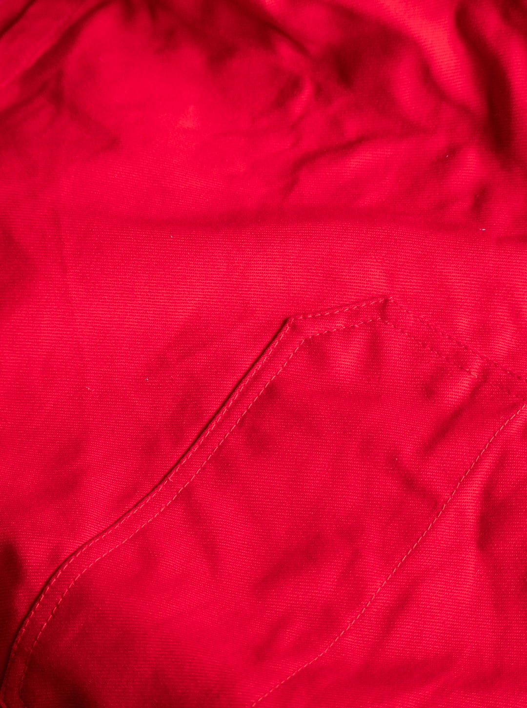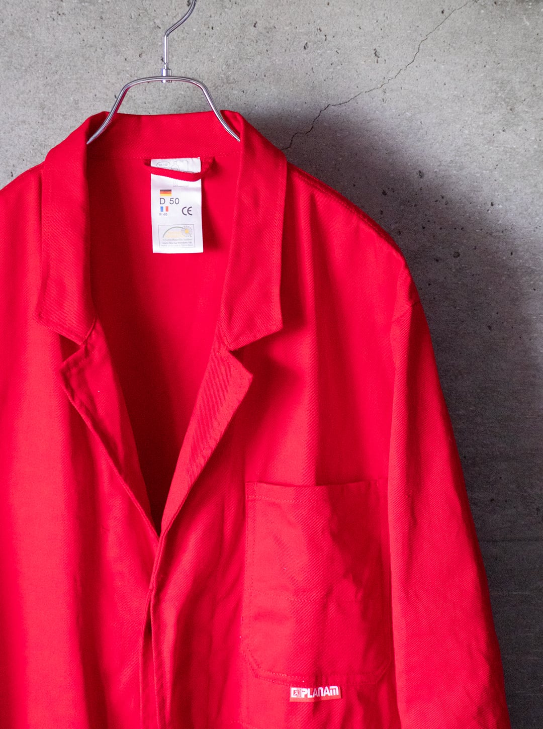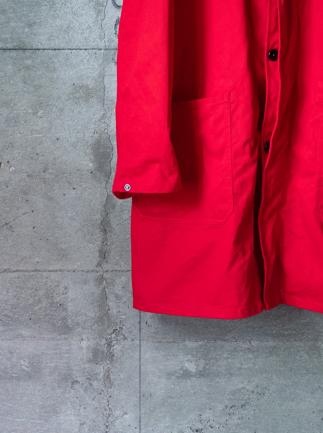 本個体は、コットン100%中肉厚ツイルの作業用コートです。単純に赤といえば赤ですが、「青み」のような「冷感」のようなものを感じる独特な赤だと思います。