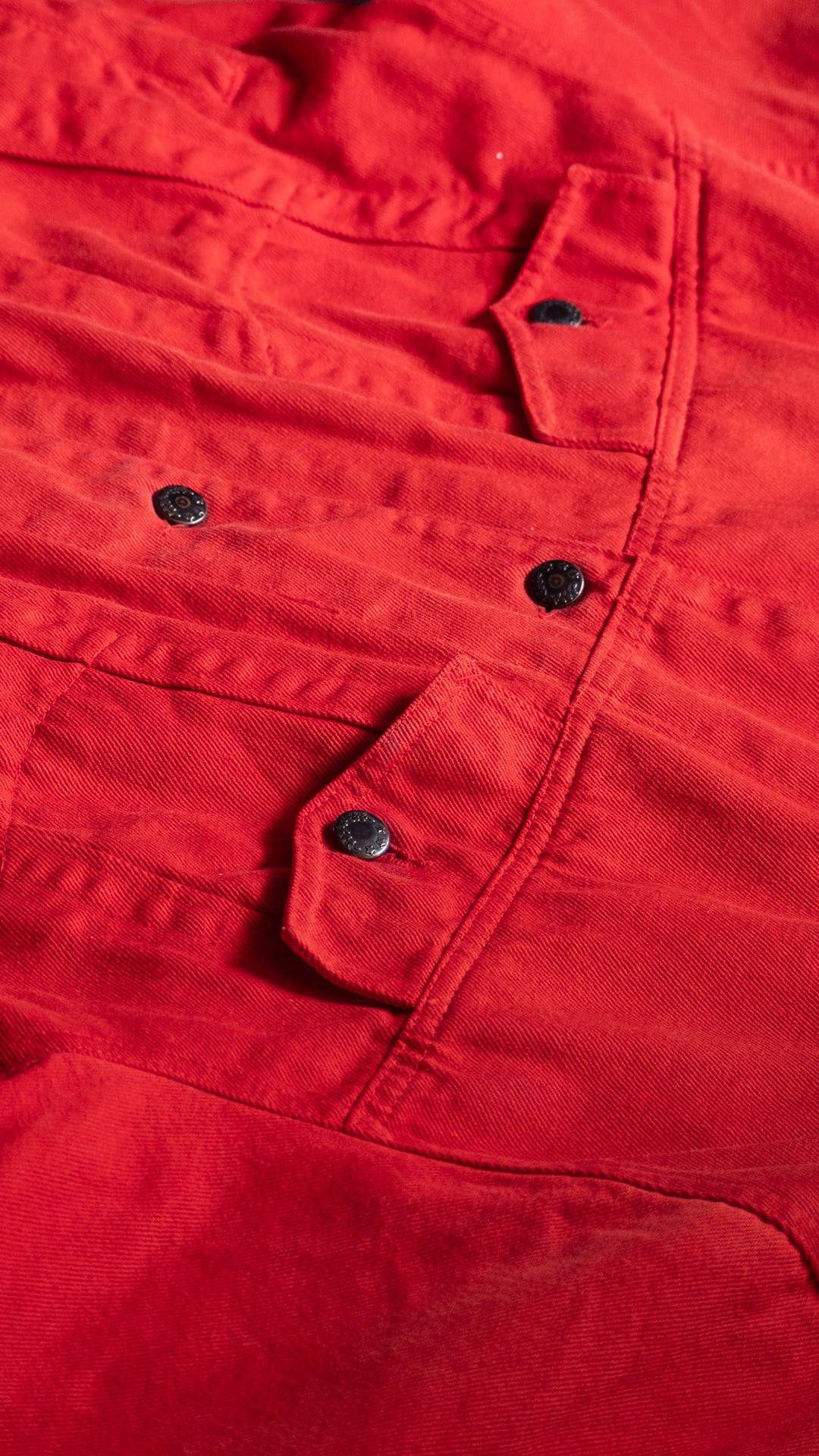 いわゆる3rd、トラッカージャケット型のディテールが落とし込まれいて、ポケットのパターンや身頃のV字切り替え、そのステッチワーク、ウエスト帯、アジャストタブなど、伝統的な作りをした一着。生地染めのカラーデニムで12-13オンスほどのしっかりとした厚みがあります。ボタンは黒塗装が施されたタックボタンで、その塗装が剥がれ、赤デニムのボタンホール周りに色移りしています。