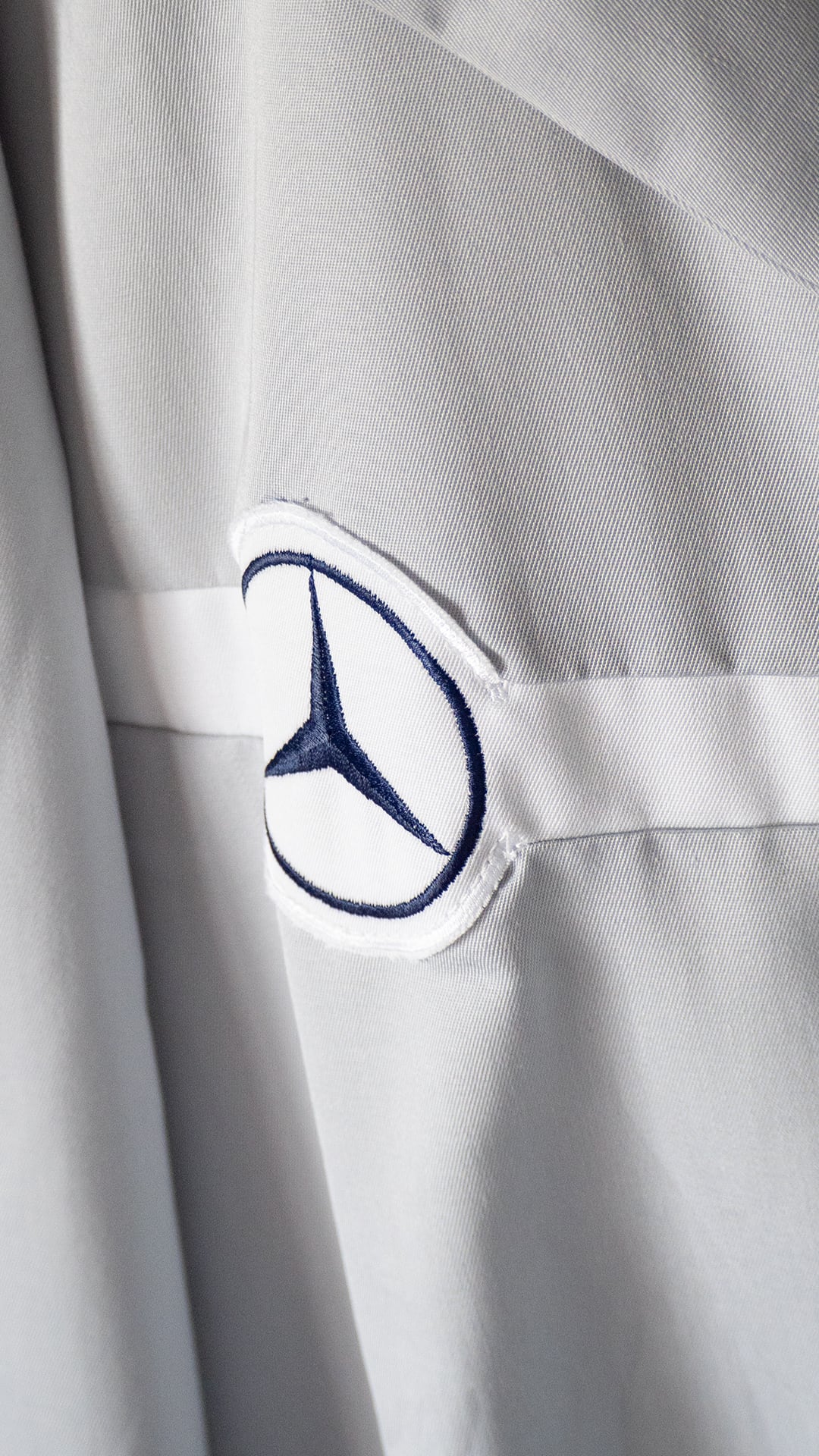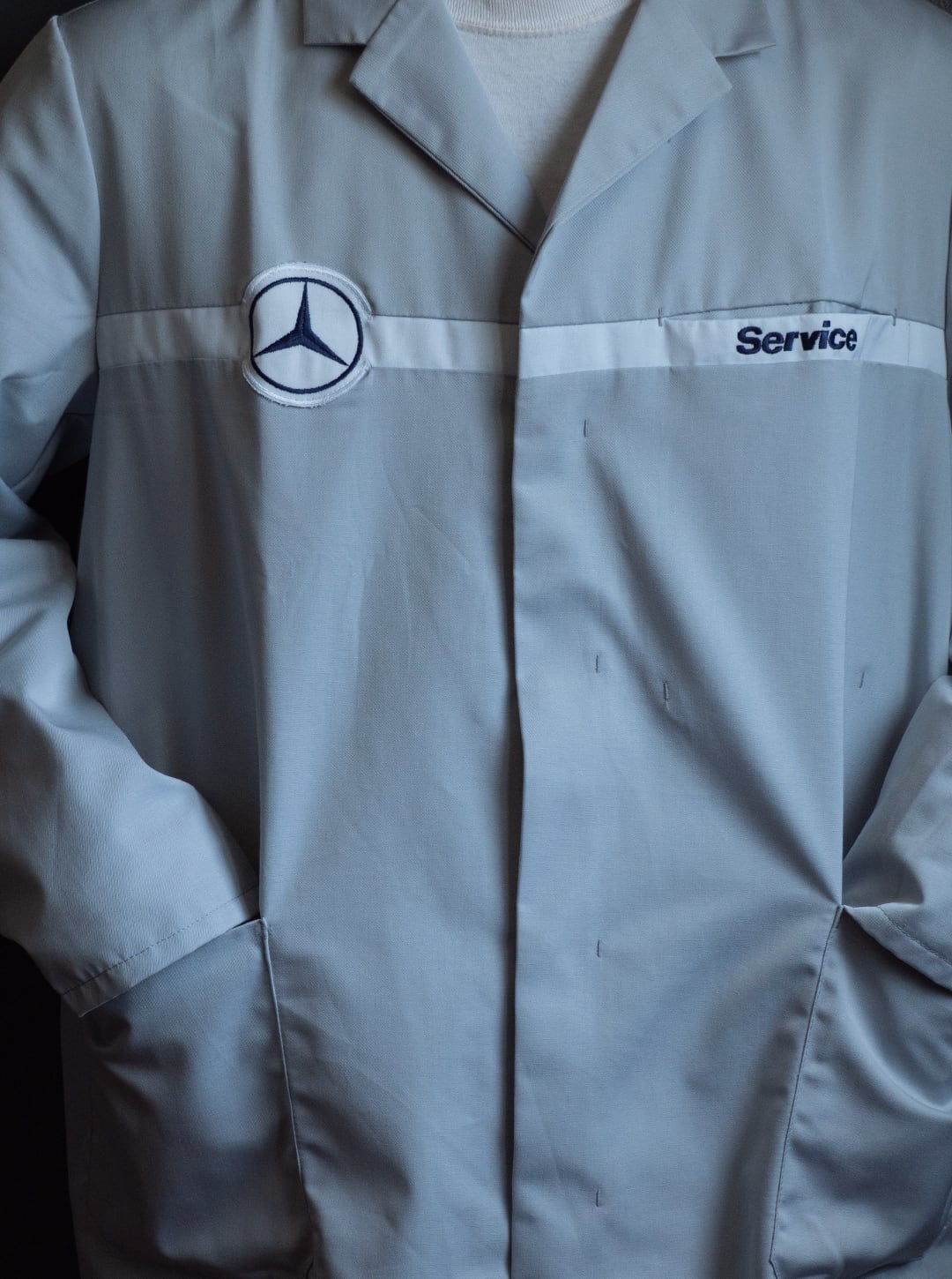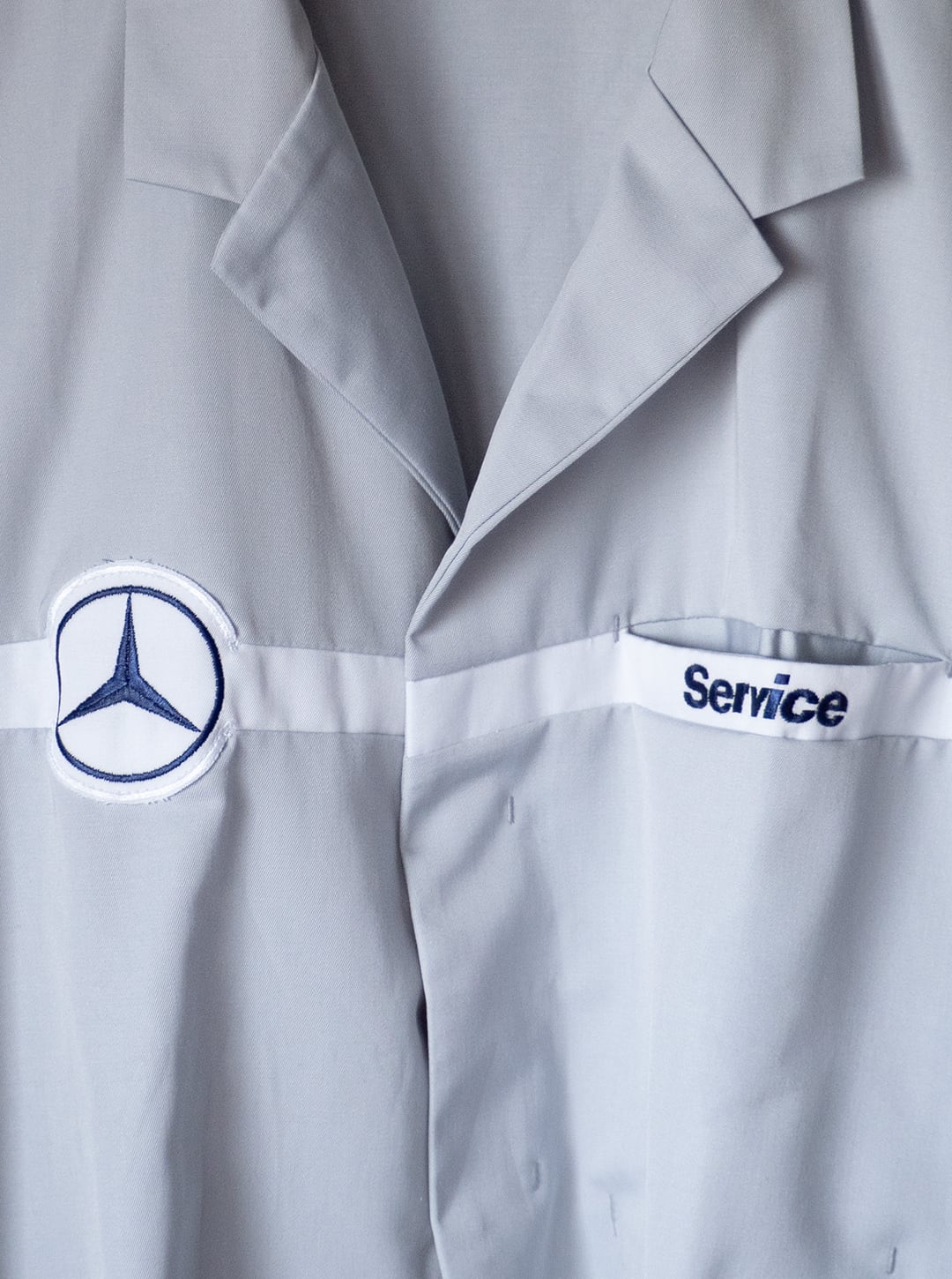 右胸にスリーポインテッド・スターのワッペン、左胸に「Service」のロゴが入っていて、胸のホワイトラインの切り替え生地が地続きになった、ベンツ別注の仕様だと思います。