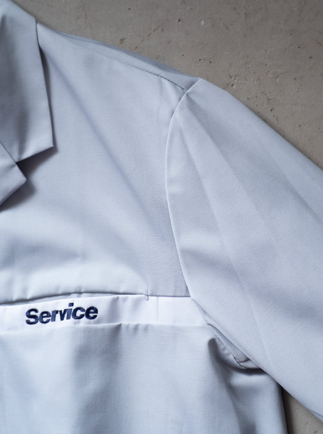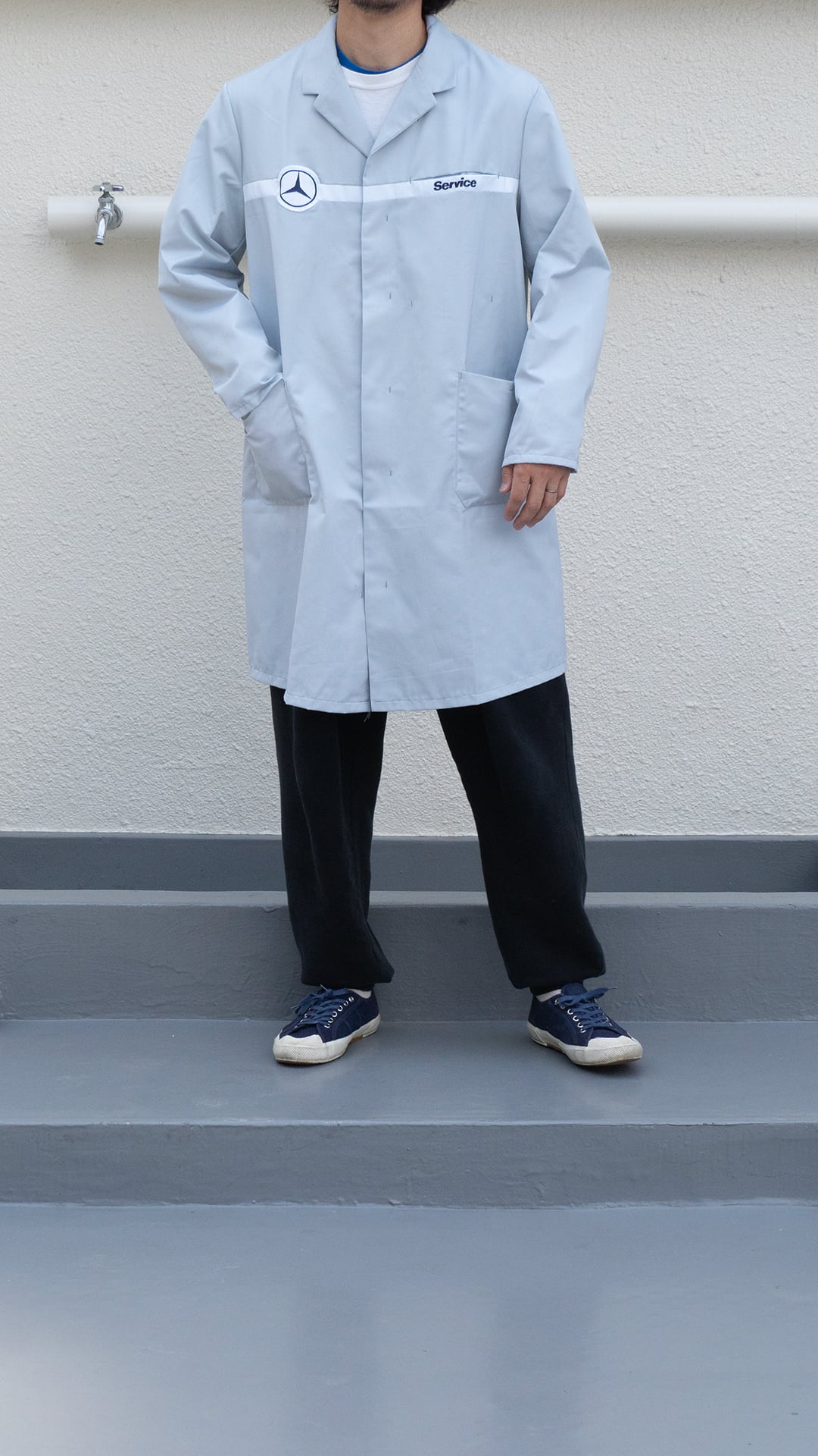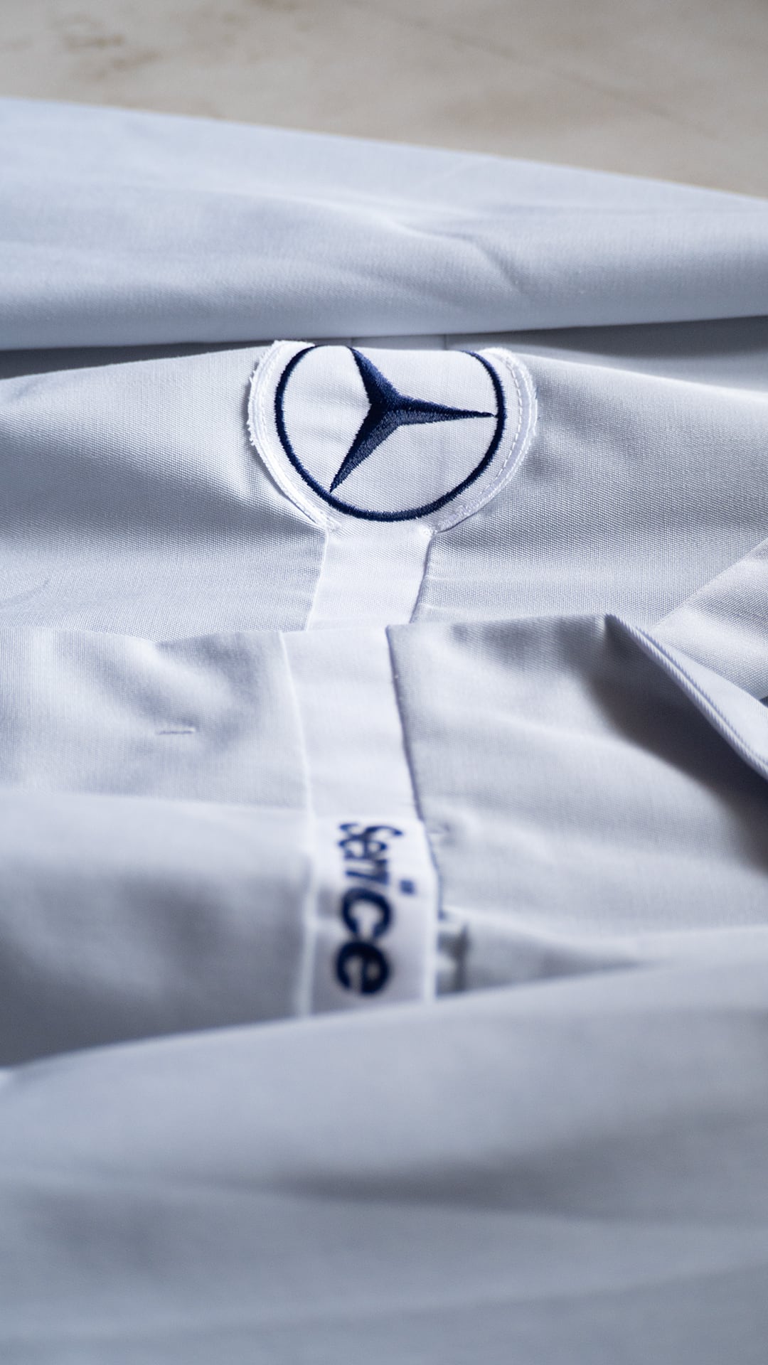 右胸にスリーポインテッド・スターのワッペン、左胸に「Service」のロゴが入っていて、胸のホワイトラインの切り替え生地が地続きになった、ベンツ別注の仕様だと思います。