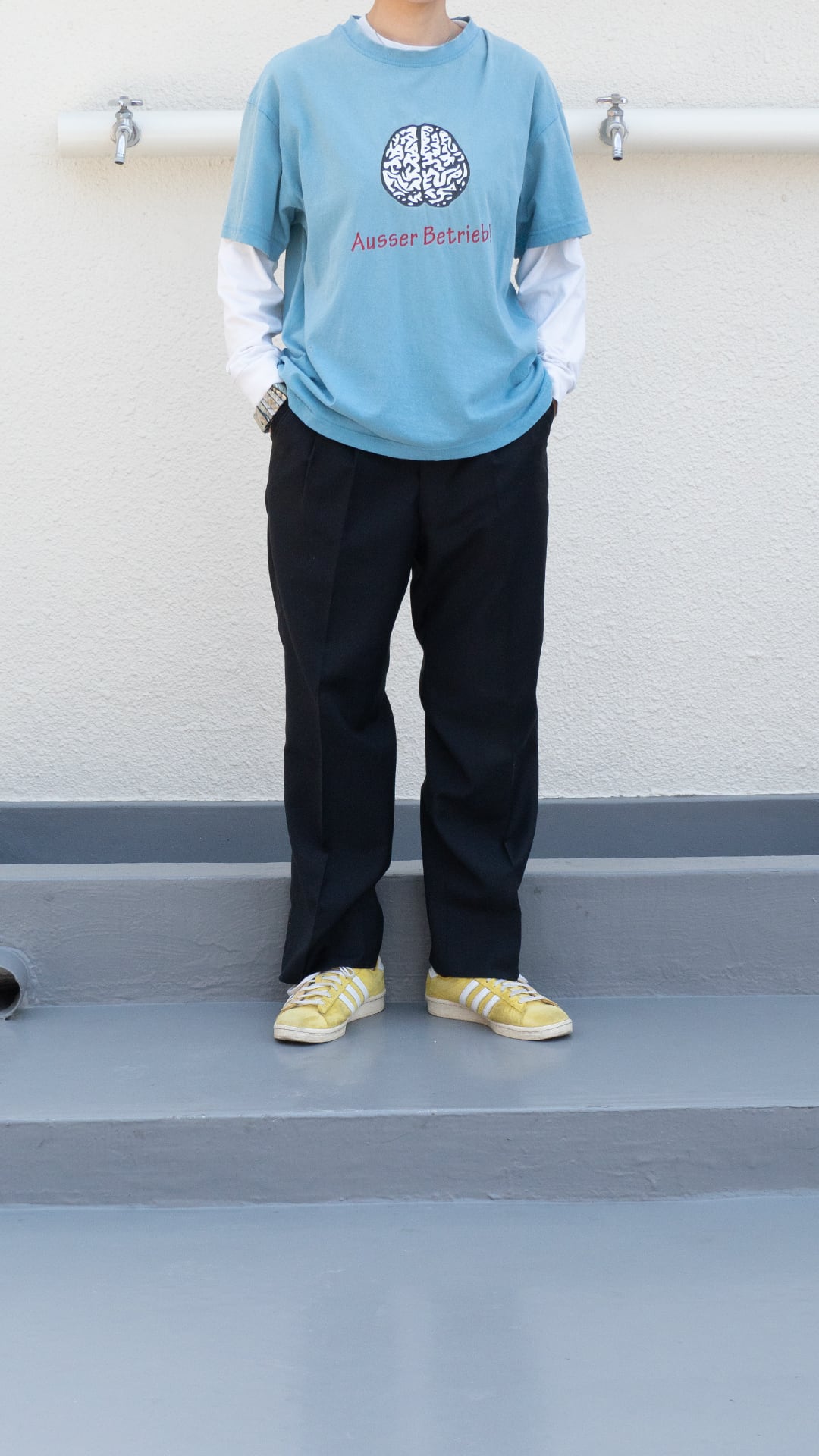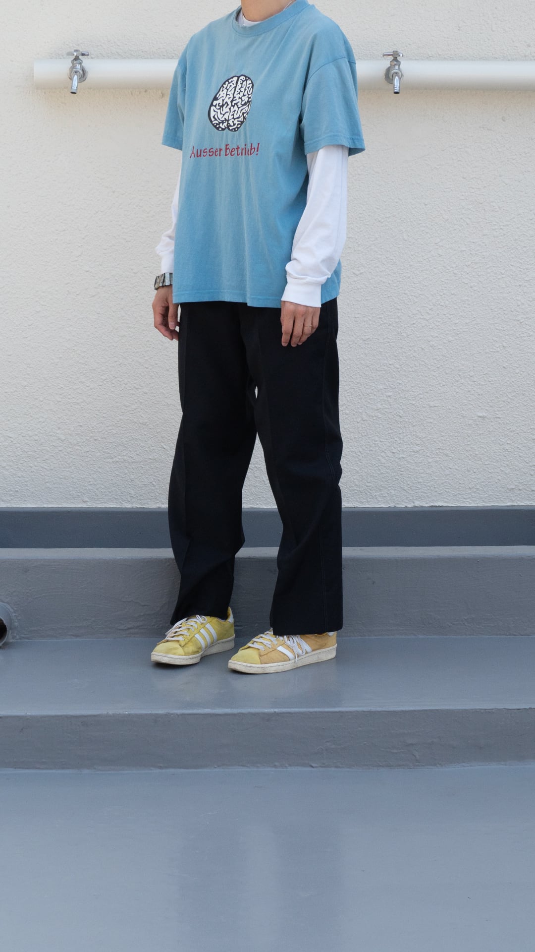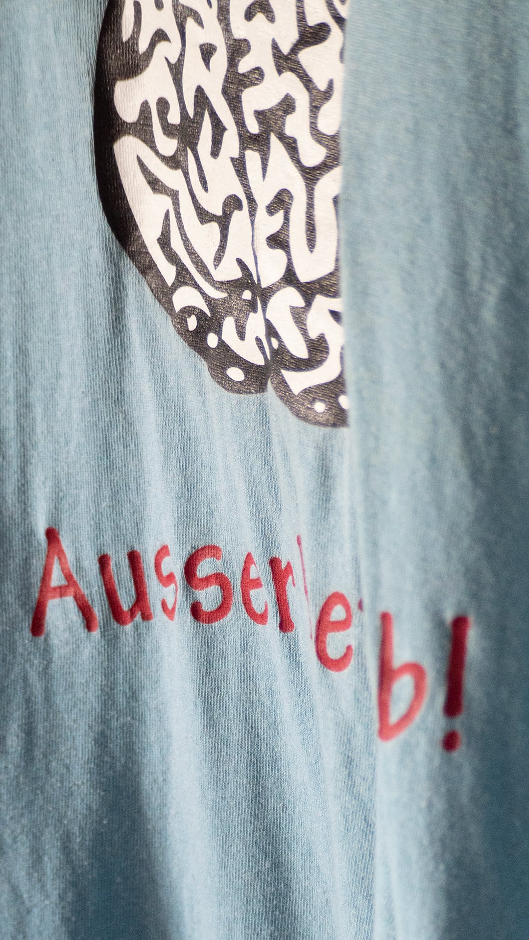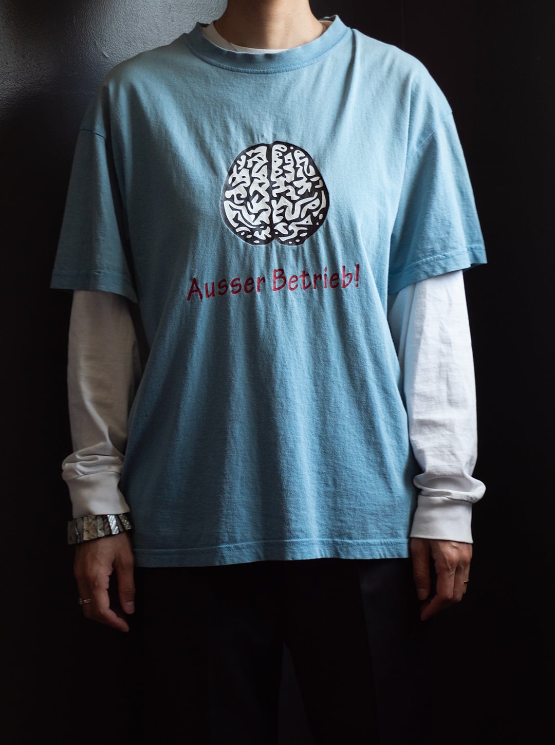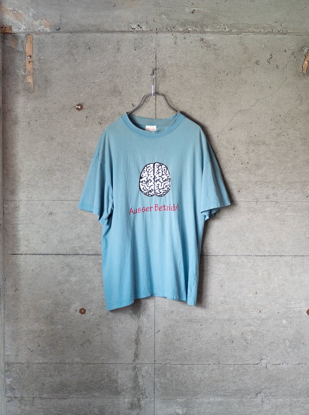 ブランドは不明ですが、ドイツ語で「Ausser Betrieb!=稼働停止中、故障中」と描かれたプリントTシャツです。