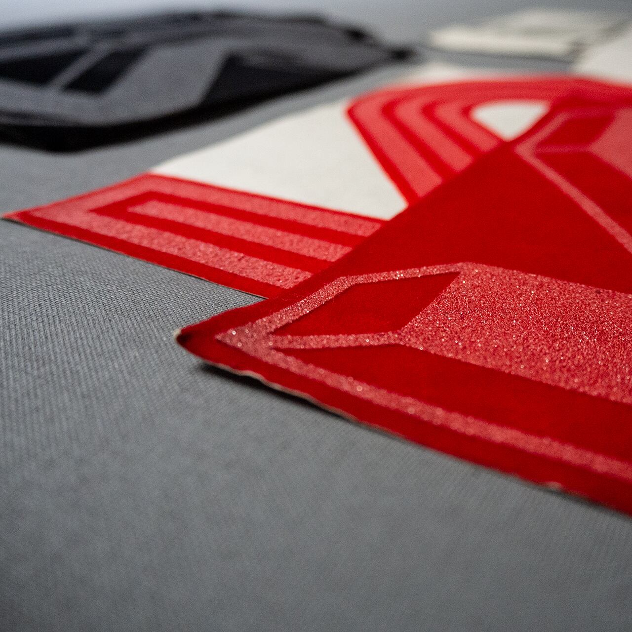熱に耐えれるあらゆる布地に圧着が可能で、アイロンを150〜200度に設定して裏から30秒間押し当てることで仕上がります。熱圧着後の数字部分は、スウェード調の短い毛羽のある仕上がりになります。