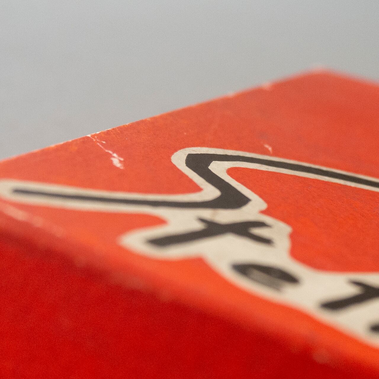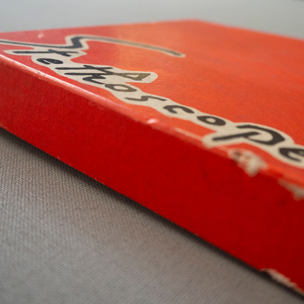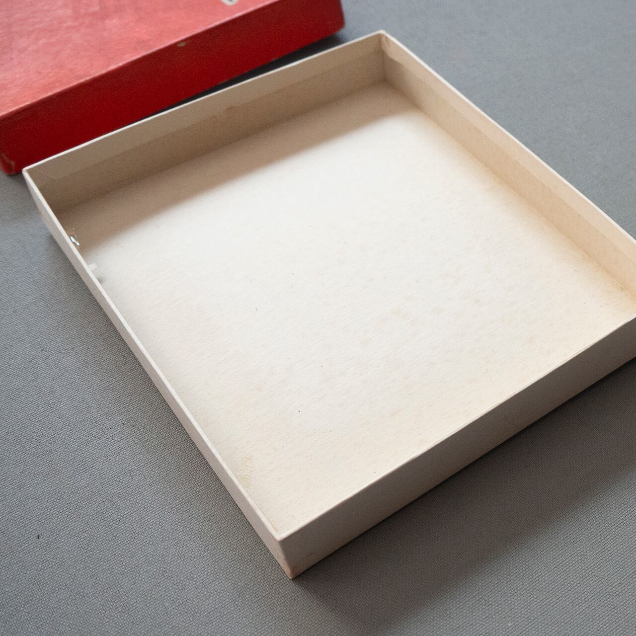 何回か塗り足したような濃い赤色はところどころ黒みがあります。テキストの外枠何ミリかは色が塗られておらず、箱の紙そのものの色になっていますが、その色もまたベージュで深みがあります。